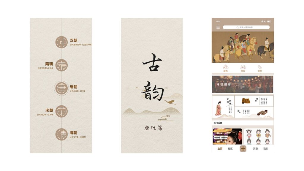 汉服古韵是⼀款传播汉服⽂化的 APP,本 APP 以唐代服饰为主,辐射了其妆容、发型等相 关内容。通过充满古典⻛味的界面,将⽤户⼀步步带⼊唐朝,体验唐朝各种华服。